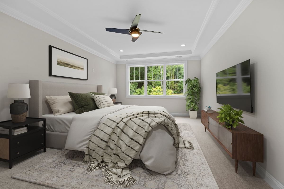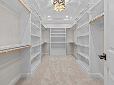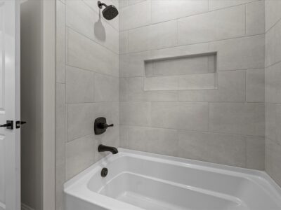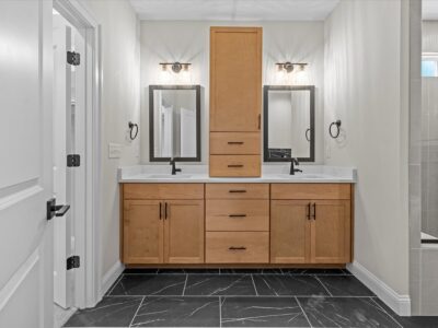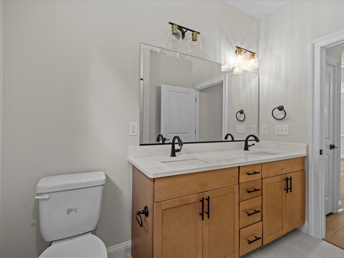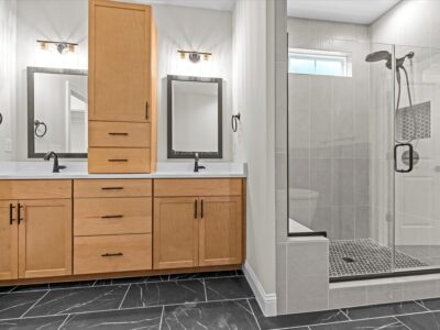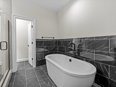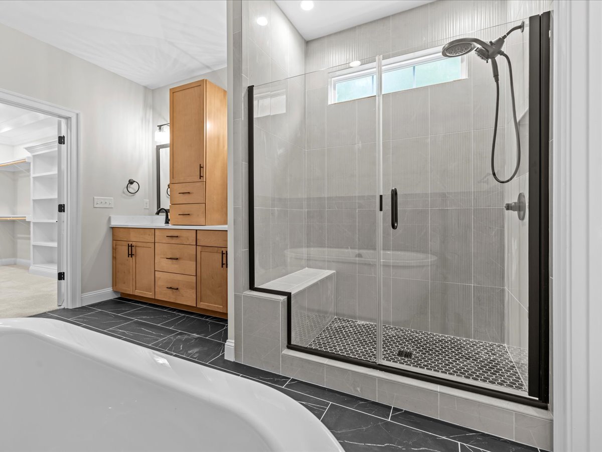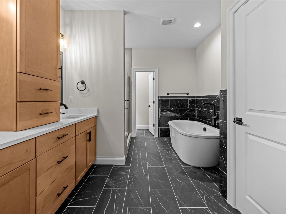 - Luxurious Primary Suite will have dual vanity with quartz top & custom storage tower, tile floor, tile shower & freestanding soaking tub.
